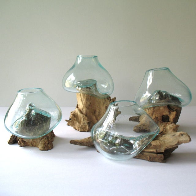Air Plant Terrarium Molten Glass Driftwood Vase Agate ... from i.etsystatic.com Mouth blown terrarium crafted from recycled molten glass slumped on teak wood tabletop decor sculpture hand crafted by glass artist on the island of bali. Glassblowing is glassforming technique that involves inflating molten glass into a bubble (or parison) , with the aid of blowpipe (or blow tube). Handmade molten glass driftwood double bowl container vase unique fish tanks. Along with a bowl and. This stunning glass art brings together the best of both worlds: Bali glass bowl on wood really beautiful to decorate your beautiful home made of terrarium glass and driftwood. Picked up this gem at the at home store for a great deal, i'v always wanted one of these but the prices were insane! These organic wood and glass terrariums are comprised of a hand blown recycled glass bowl sitting atop a piece of driftwood.